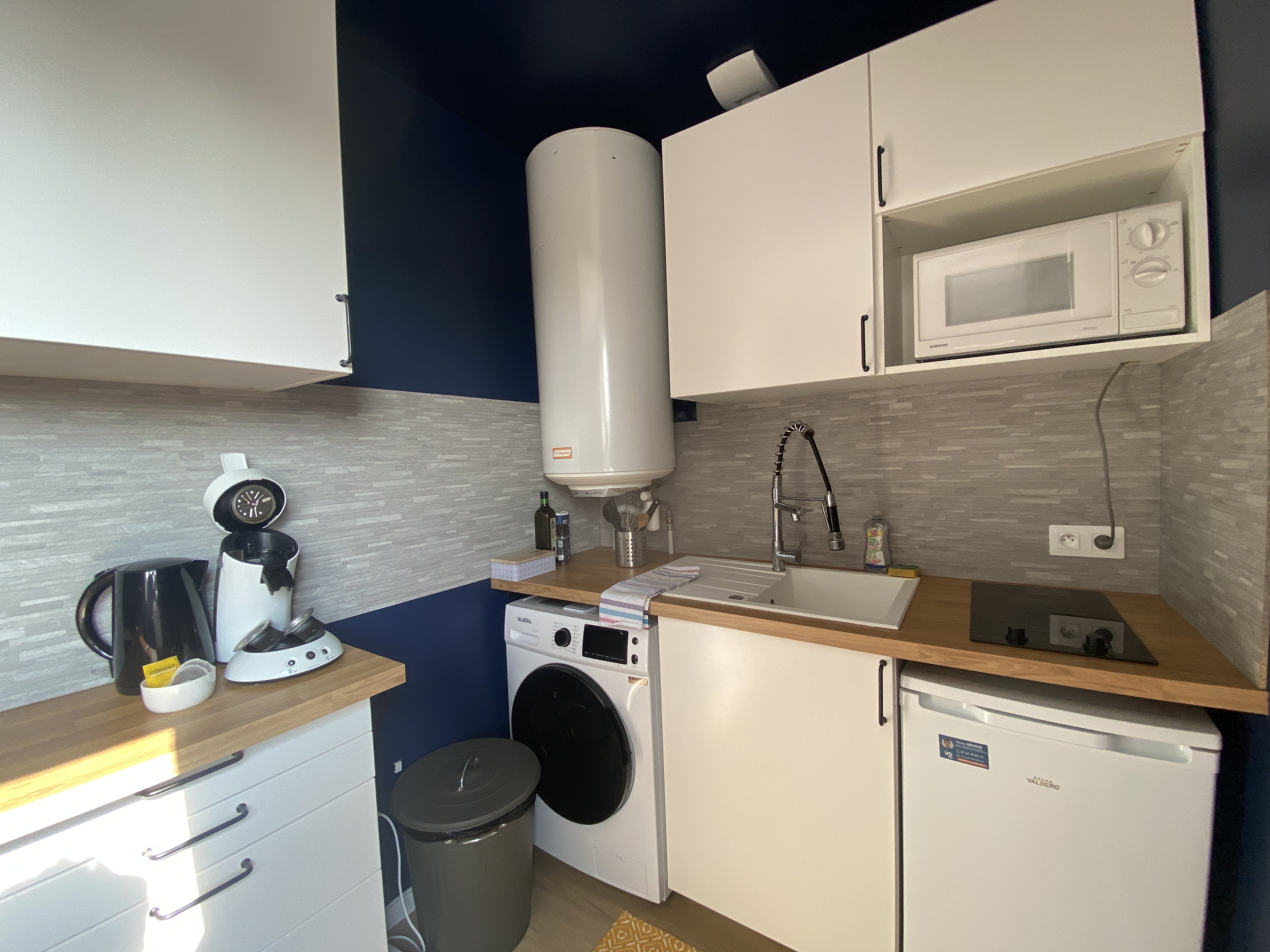 La cuisine entièrement équipée, dispose de tout le nécessaire du quotidien : plaques de cuisson, four, réfrigérateur, vaisselle, machine à laver, ustensiles et rangements optimisés.
